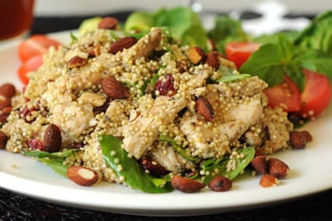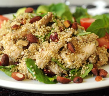 Resumen Fácil: Cocina quinoa y pollo, mezcla con verduras picadas, adereza y sirve.