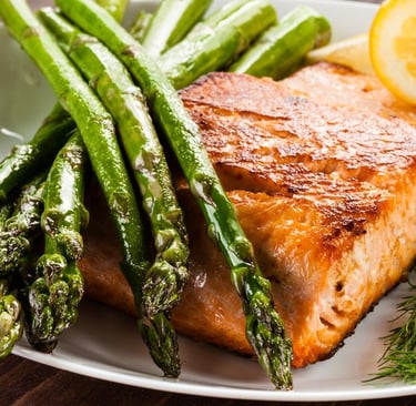 Resumen Fácil: Hornea salmón y espárragos con aceite, limón, sal y pimienta.